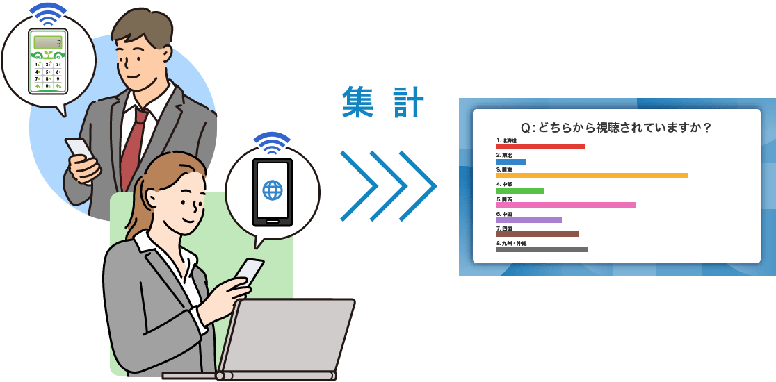プレゼン資料に集計機能を持たせることで参加者の意欲を高め、一体感を生み出し、より効果的な発表を行うことが出来ます。