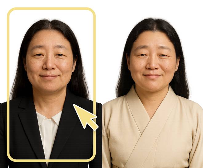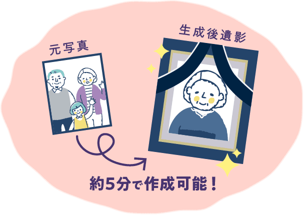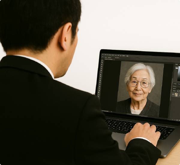ご遺族様より頂くお写真をAIみかえるにアップロードするだけで遺影写真が完成します。