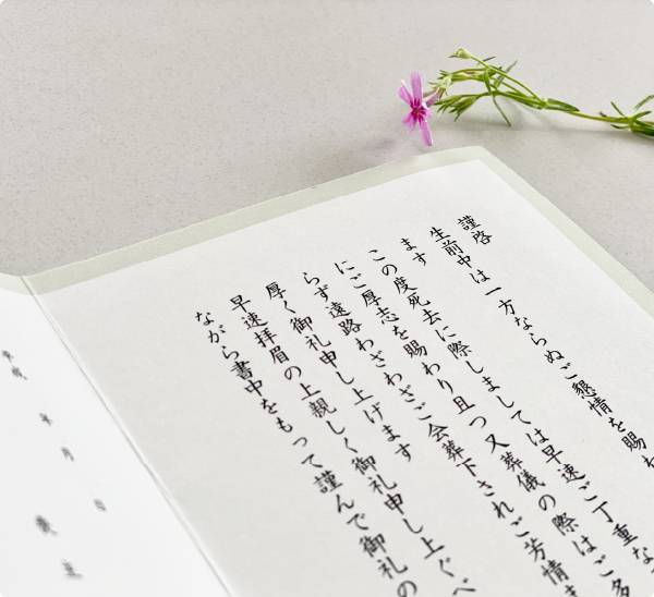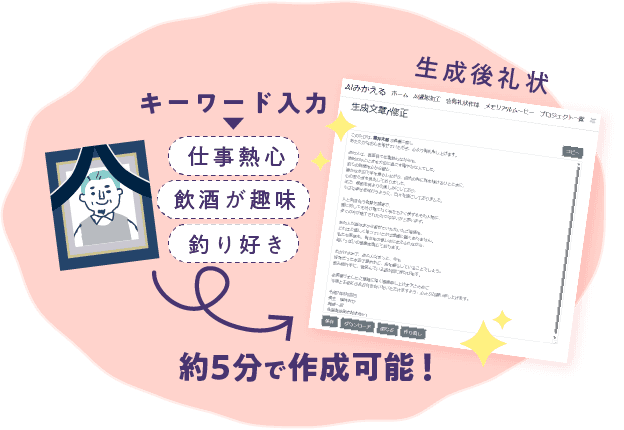 故人のエピソードや人柄をヒアリングした内容を入力、お好みの文章の雰囲気や宗教形式などを選択すると、自動で礼状が作成されます。