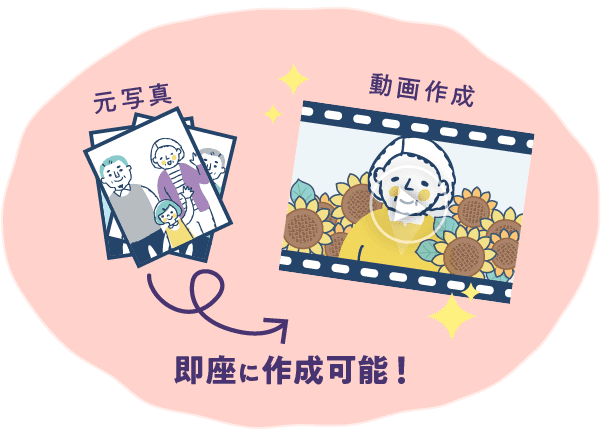 ご家族や友人との思い出の写真をアップロードし、ドラッグ&ドロップで表示したい順に並び替えて、用意されたBGMを選択したら、「作成」ボタンを押すだけでメモリアルムービーが完成します。