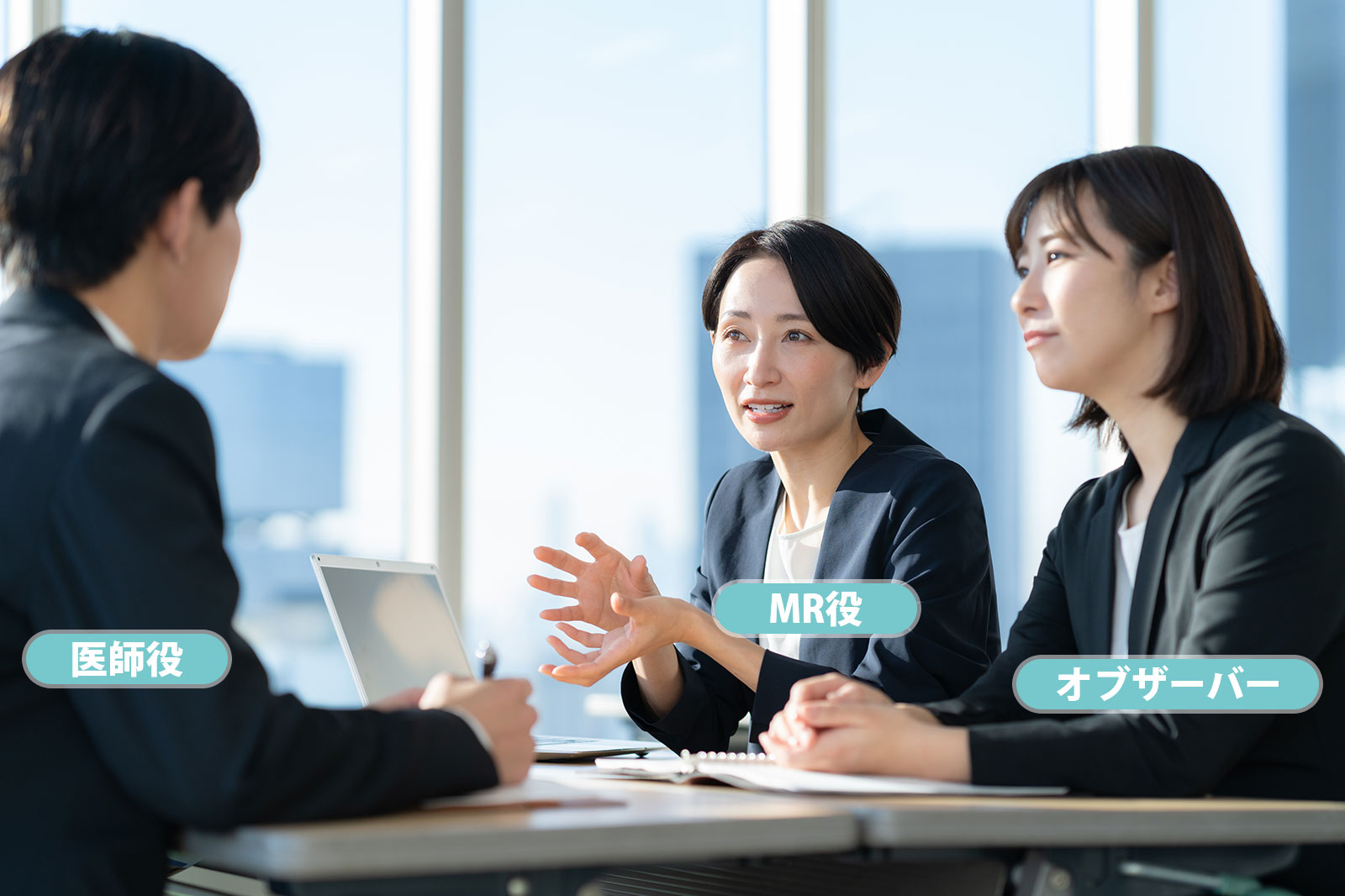 通常のロールプレイでは、MR役、医師役、オブザーバー役といった3人が集まる必要があります。しかし、前述のように昨今の状況でMRが3人集まるのは難しいことです「TalkAId」なら、医師役とオブザーバー役をAIに任せられるため、MR一人でも効果的なロールプレイが可能です。