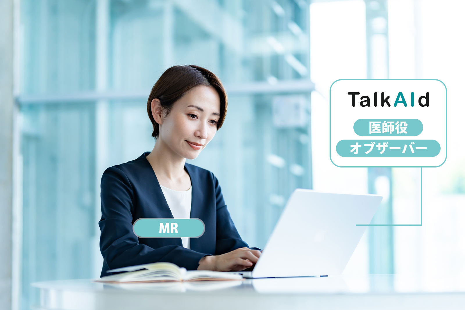 「TalkAId」は、AIがトークををAid(支援)する、という意味から名付けられました。ChatGPTをエンジンとして採用しており、製薬会社のMR(医薬情報担当者)がAIを相手に、自社製品に関するロールプレイをいつでもどこでも何度でも行えるサービスです。ブラウザ上で利用できるため、PCやスマホを使って一人でもロールプレイが可能です。また、AIとの会話はテキスト入力だけではなく、音声でも行うことができます。