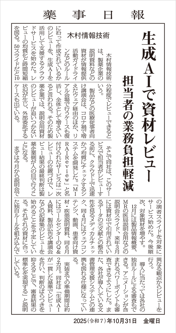 2025/10/31 メディア掲載 製品・サービス 2025年10月31日(金)付の「薬事日報」に、資材の一次レビューを生成AIが担う、製薬企業向けAIサービス「MIRAI Review(ミライレビュー)」に関する記事が掲載されました。 生成AIで資材レビュー 担当者の業務負担軽減 (画像をクリックすると、別ウィンドウでPDFが開きます) ※この記事は、薬事日報社の許可を得て掲載しております。
