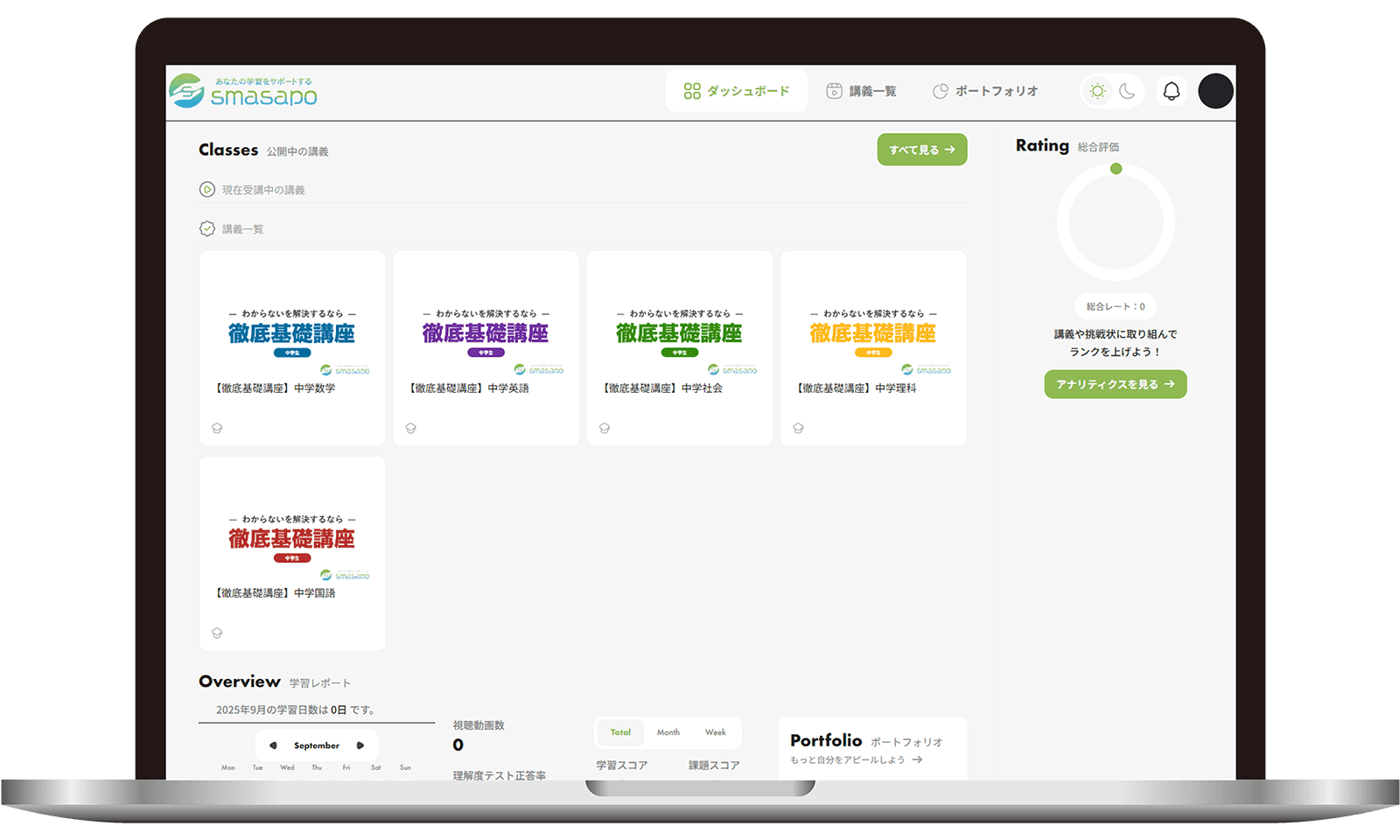 『smasapo』は、生徒一人ひとりに最適化された学習を提供する教育プラットフォームです。主な機能は、学習用動画の視聴や学習ポートフォリオの管理機能。これにより、生徒の学習進捗を把握し、講師が最適な指導を行うことができます。