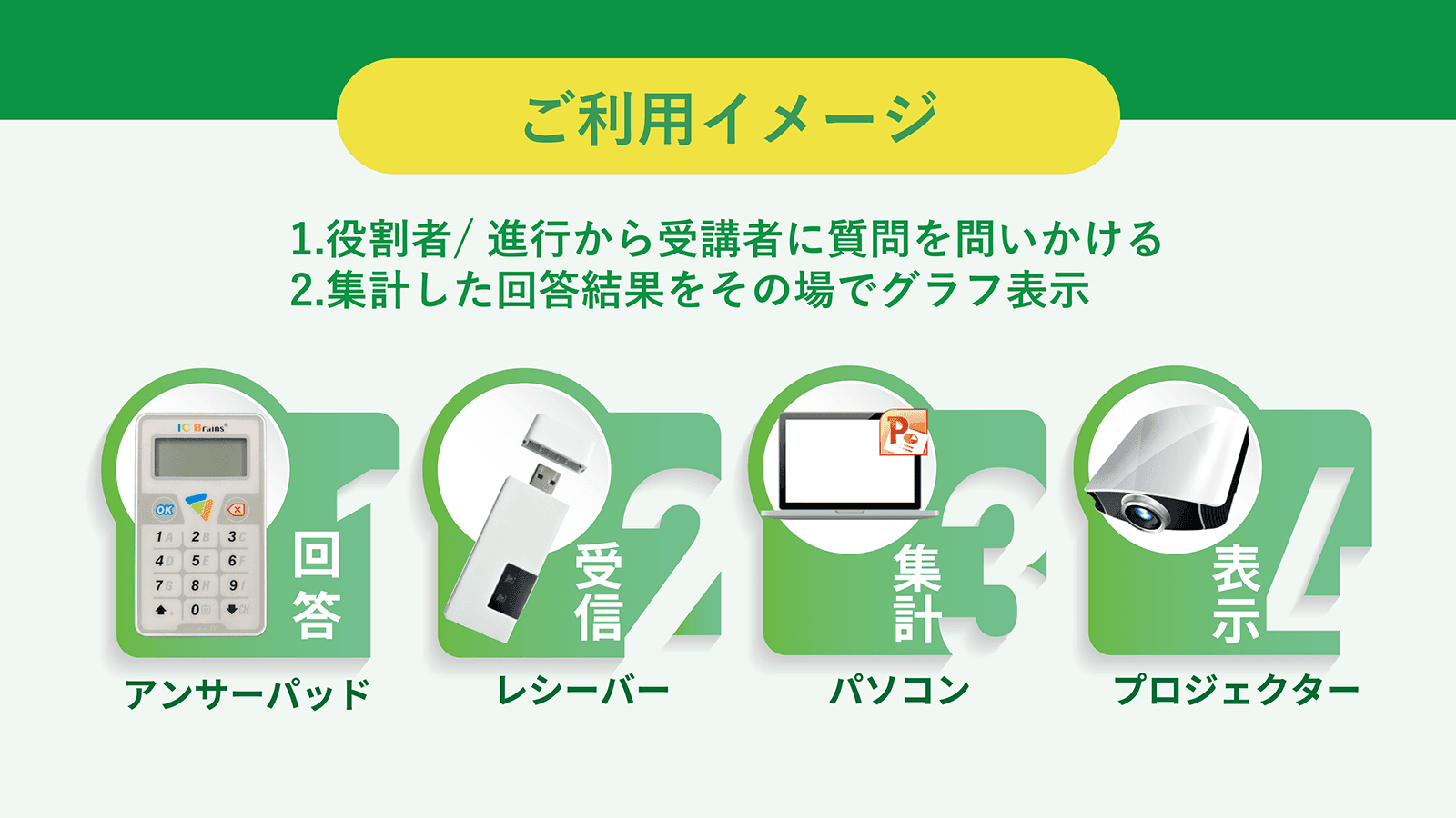 ICブレインズは「すべてのリアルをビジュアル化」をモットーに、アンサーパッドを活用したリアルタイム集計表示システム「Socratec SV」をはじめ、講演会・教育・学会向けの来場管理やイベントシステムを提供しています。