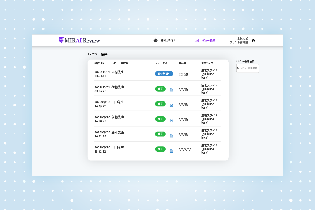 『MIRAI Review』は、製薬企業が医療関係者や患者向けに配布する各種資材について、製薬業界のルールを遵守しているかを生成AIが一次レビューするサービスです。2025年10月の提供開始以降、多くのお問い合わせをいただき、PoCの実施や本導入が進むなど高い関心が寄せられています。