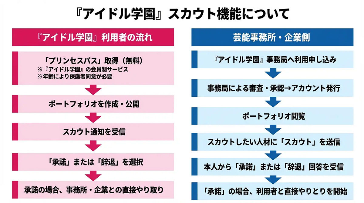 『アイドル学園』は、夢を追いかける若者と、アイドルの力を必要とする芸能事務所・企業をつなぐ"懸け橋"となることを目指しています。これまで、専門家によるレッスンやキャリア支援コンテンツを通じて、学びと成長の機会を提供してまいりましたが、実際の活躍機会やデビューへのつながりも重要と考え、今回の「スカウト機能」の提供開始に至りました。