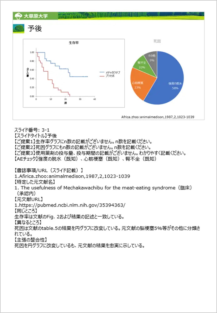 「メディカルチェック機能」は、スライド内に記載された書誌事項をもとにWeb検索を行い、該当する元文献が記載されているWebページを特定したうえで、スライド内のグラフ・表・図と元文献の内容が一致しているかを自動でチェックする機能です。