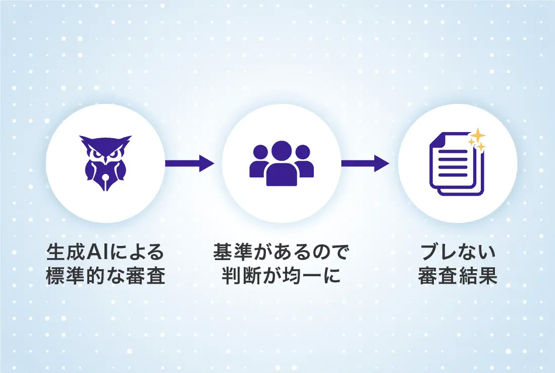 生成AIが一貫した基準でレビューを行い、判断のばらつきを抑えることで、審査結果の標準化を実現します。