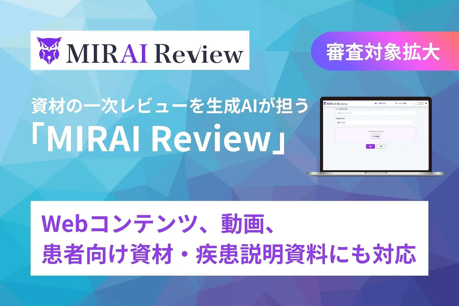 業務支援AIソリューションを展開する木村情報技術株式会社(本社:佐賀県佐賀市、代表取締役:木村 隆夫、以下「木村情報技術」)は、製薬企業向け資材一次レビューAIサービス『MIRAI Review(ミライレビュー)』において、一次レビュー(審査)の対象範囲を拡大し、新たにWebコンテンツ、動画、疾患解説・患者向け資材に対応したことをお知らせします。