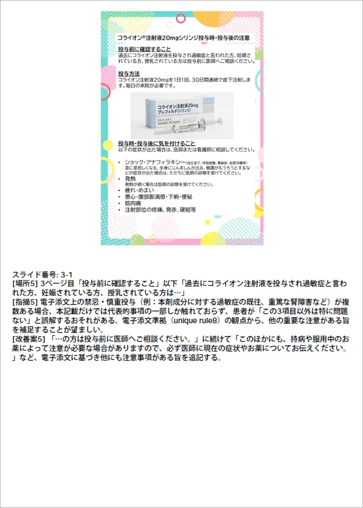 [指摘1] unique ruleの8に違反しています。電子添文の「8.1」には副作用として発熱が高頻度に認められる旨の記載はありますが、「37度以上」という具体的な基準値の記載はなく、電子添文の内容から逸脱しています。